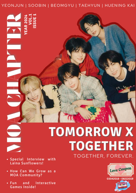 Hello, dear MOAs! 🌸We’re beyond excited to welcome you to our little corner of the universe, where all things MOA come to life. This space is dedicated to you — our wonderful, ever-supportive fandom. Here, you'll find every issue of the Fan Magazine, where we celebrate everything about TXT, from their incredible music to the passionate community we’ve built together.But that’s not all! You’ll get exclusive behind-the-scenes content, sneak peeks, and spoilers about upcoming issues. We also invite you to join us by contributing to the magazine through volunteer opportunities and leaving reviews on what you’d like to see next. Every voice matters here, and we can’t wait to have you involved in making this space even more special.Thank you for being a part of this journey with us. Together, we’ll make every chapter of Moa Chapter something unforgettable!With love,